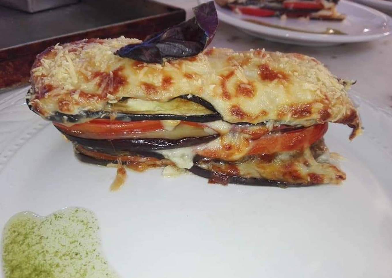 - Formar una torre colocando láminas de berenjena, rodajas de tomate, mozzarella, hojas de albahaca y los dientes de ajo picado en brunoise.