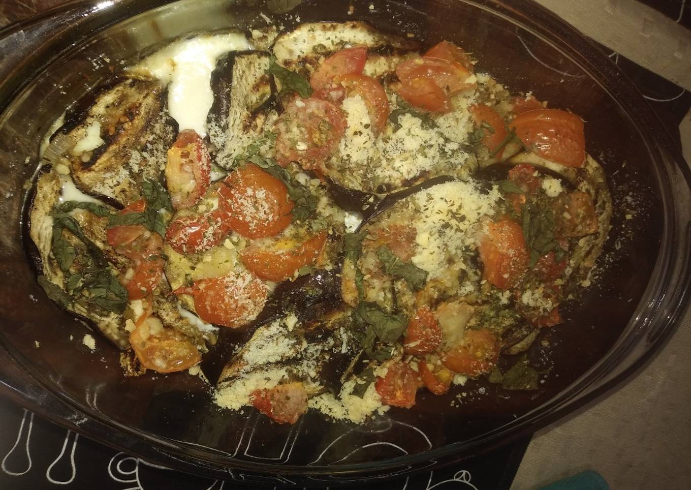 - Capa de berenjenas, cebolla rehogada, queso port salut, ricota, otra capa de berenjenas. Chorro de aceite de oliva, tomates cherry cortados, albahaca picada, queso rallado. Mandar al horno 200° durante 15 a 20 min