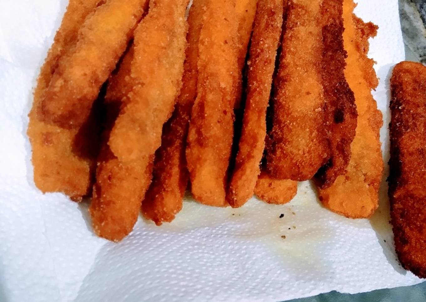 - Cortamos la berenjena en tiras las pasamos por almidón de maíz luego por huevo y luego por pan rallado
