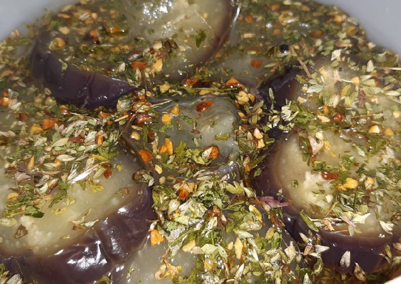 - Luego en mi recipiente puse: un poco de aceite, un poco de todos los condimentos y último vinagre un chorrito. Y ahí coloqué rodajas de berenjena. Así sucesivamente. Y listo! A pesar de que es mi primera vez haciéndolas están riquísimas! Anímense! No tengan miedo 🙂