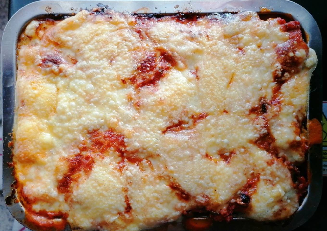 - Luego, le puedes colocar queso rallado (yo coloqué queso vegano) y se pone al horno por unos 30 a 40 minutos para que todo se junte y la berenjena quede suave y rica.