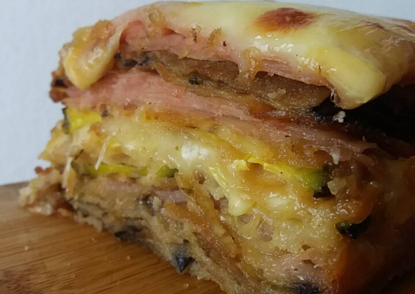 - Una Capa de muzzarella...una capa de zapallitos...una capa de jamón... Y así hasta terminar con muzzarella por arriba...y lo llevamos al horno
