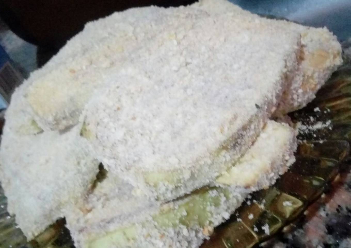 - Ligar los huevos en un plato hondo y ponerle los condimentos. Luego vamos poniendo las berenjenas adentro, vuelta y vuelta.