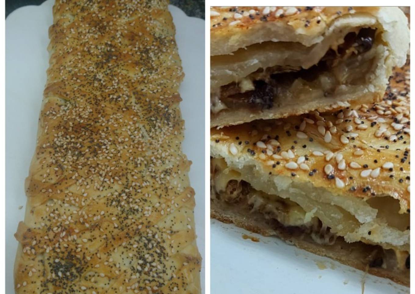 - Con el bollito de masa que reservamos, lo estiramos y hacemos tiritas cruzadas. Pintamos con huevo y espolvoreamos con sรฉsamo y amapola
