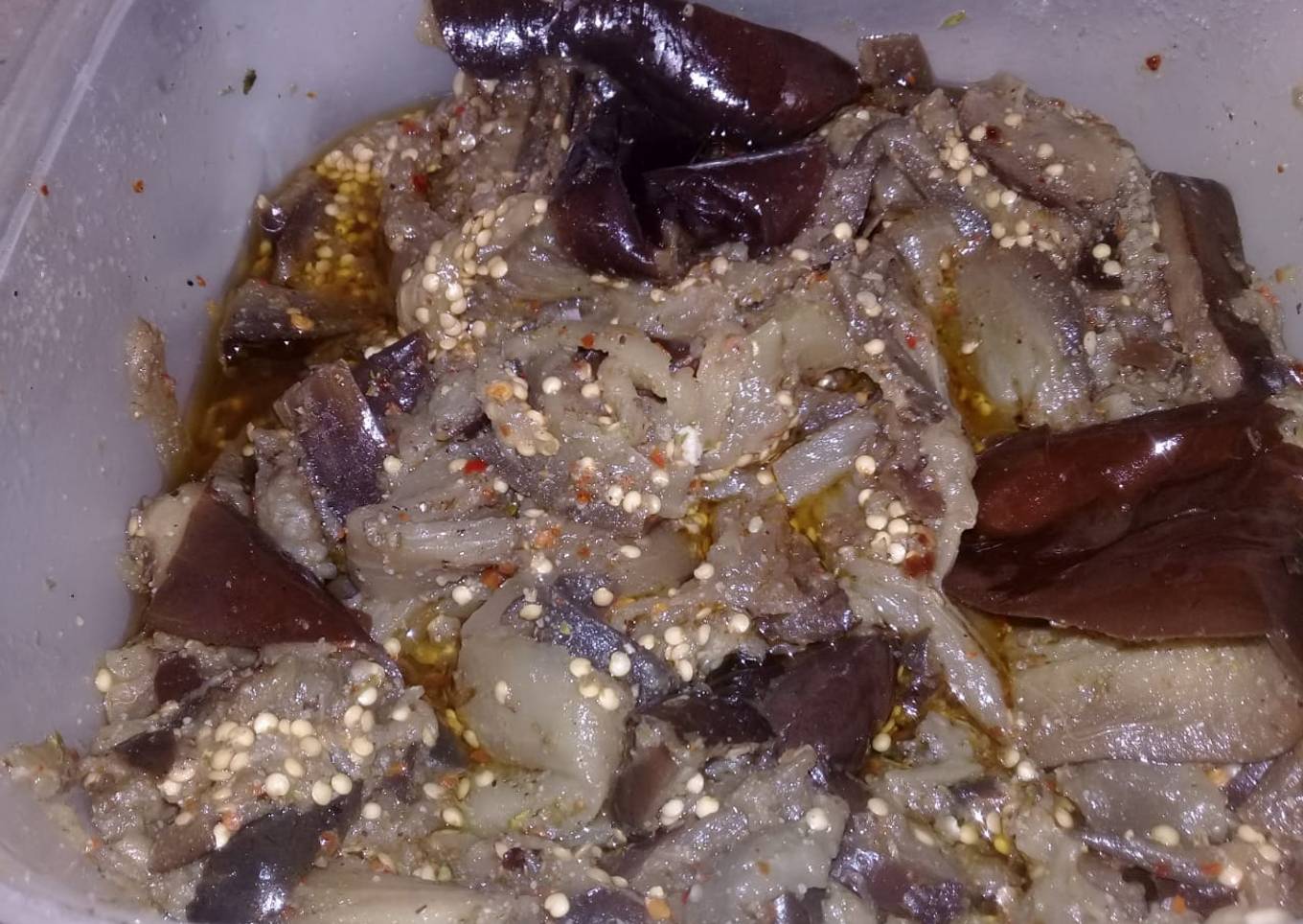 - Hervir las berenjenas, cortadas, por unos 20 minutos aproximadamente, luego colar, dejar escurrir y cuando estén bien frías, poner capas de berenjena, aceitar, salar y condimentar cada capa así hasta terminar(colocar en recipiente cerrado para que las cosas que tengas en la heladera no tomen el olorcito del escabeche)