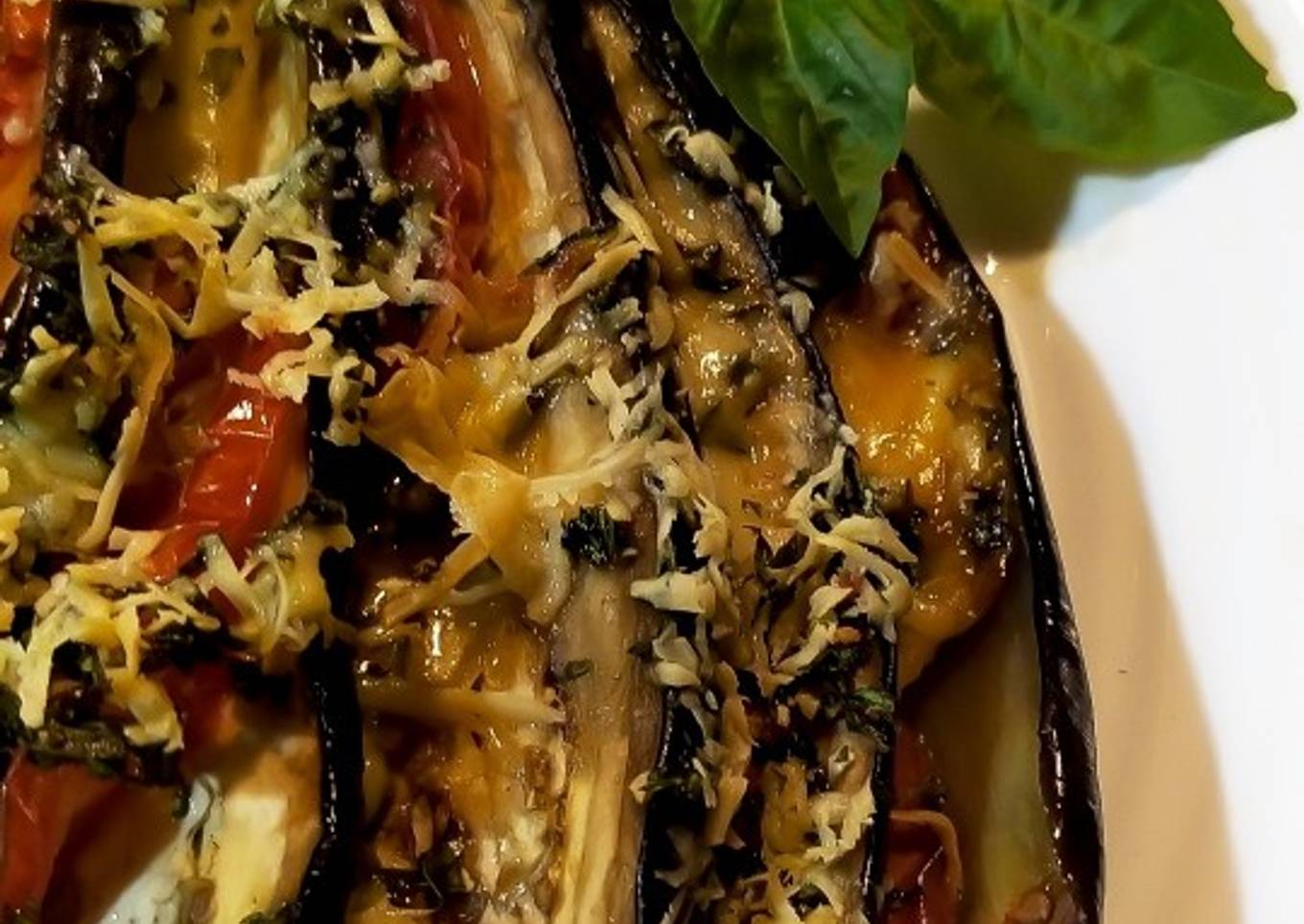 - Proceder a colocar en cada corte de la berenjena una rodaja de tomate, una de queso y así sucesivamente en cada corte. Espolvorear con ajo y perejil. Salpimentar. Rociar con aceite de oliva y queso parmesano.