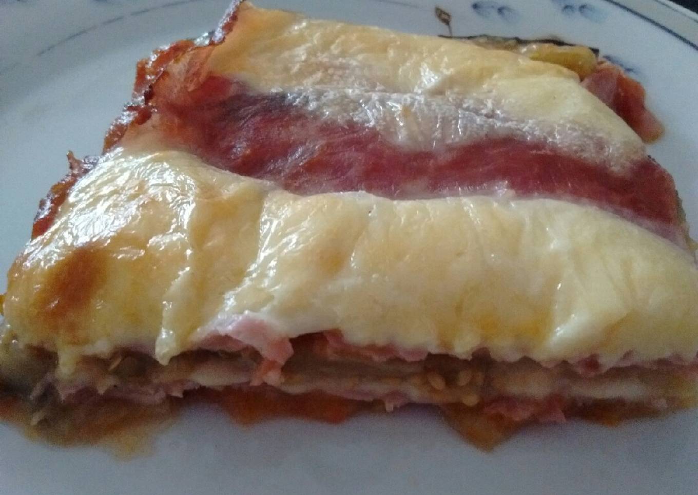 - En una fuente para horno puse una capa de berenjenas (no le puse nada abajo), cubrí con salsa, puse las fetas de jamón y arriba el queso. Me alcanzó para dos capas. Llevar al horno hasta que se derrita bien el queso.