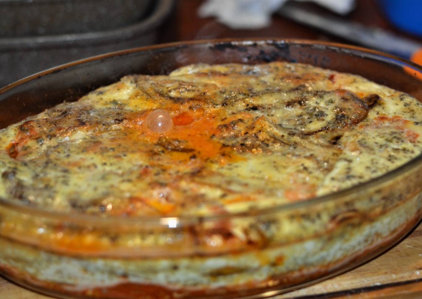 - Volcamos en un bol y mezclamos, luego lo volcamos sobre la última capa de berenjena y lo introducimos en el horno ya calentado a temperatura media hasta cocinar todo, aproximadamente 30 minutos