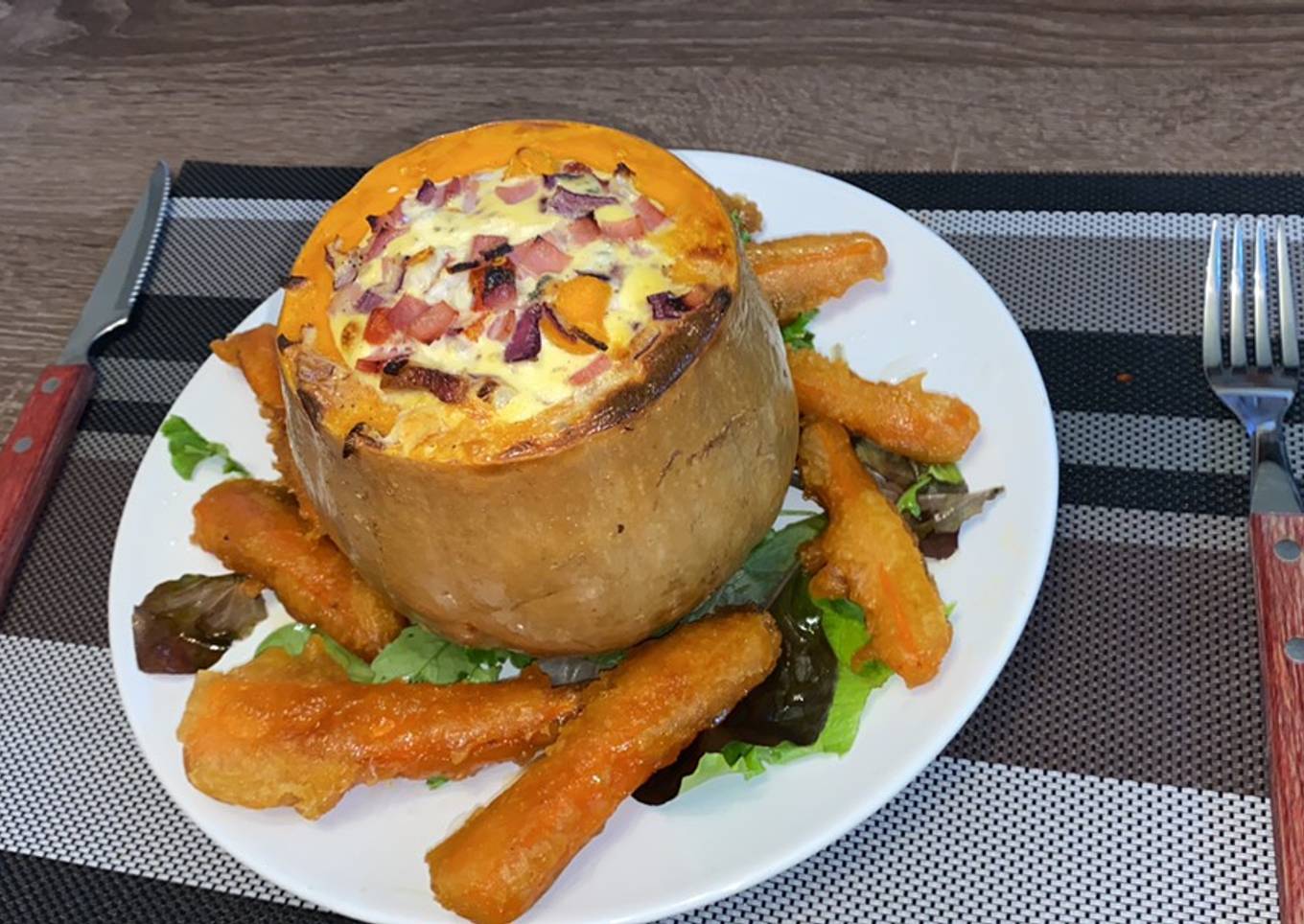 - En una sartén calentamos un poco de aceite, y freímos suavemente los ingredientes picados, mientras tanto en un bol batimos los huevos, una vez batidos añadimos la nata y removemos bien, añadimos la pimienta y la nuez moscada y removemos, cuando esté listo añadimos la fritura al bol, mezclamos todo bien, y rellenamos la calabaza, y metemos al horno previamente caliente y dejamos unos 30 minutos