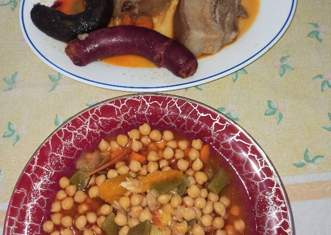 - Cuando los garbanzos y la carne estén tiernos echamos las habichuelas y la calabaza peladas y a trozos. Echamos también la morcilla.