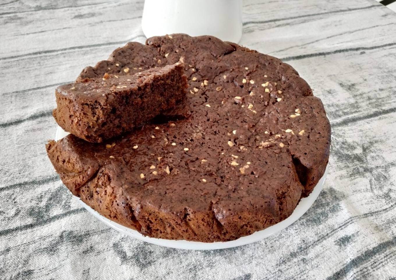 - Añade a la mezcla la harina, el chocolate en polvo, el azúcar y la levadura y remueve la mezcla. A continuación, vierte la mezcla en un molde de horno previamente forrado con papel de horno. Decora con almendras troceadas.