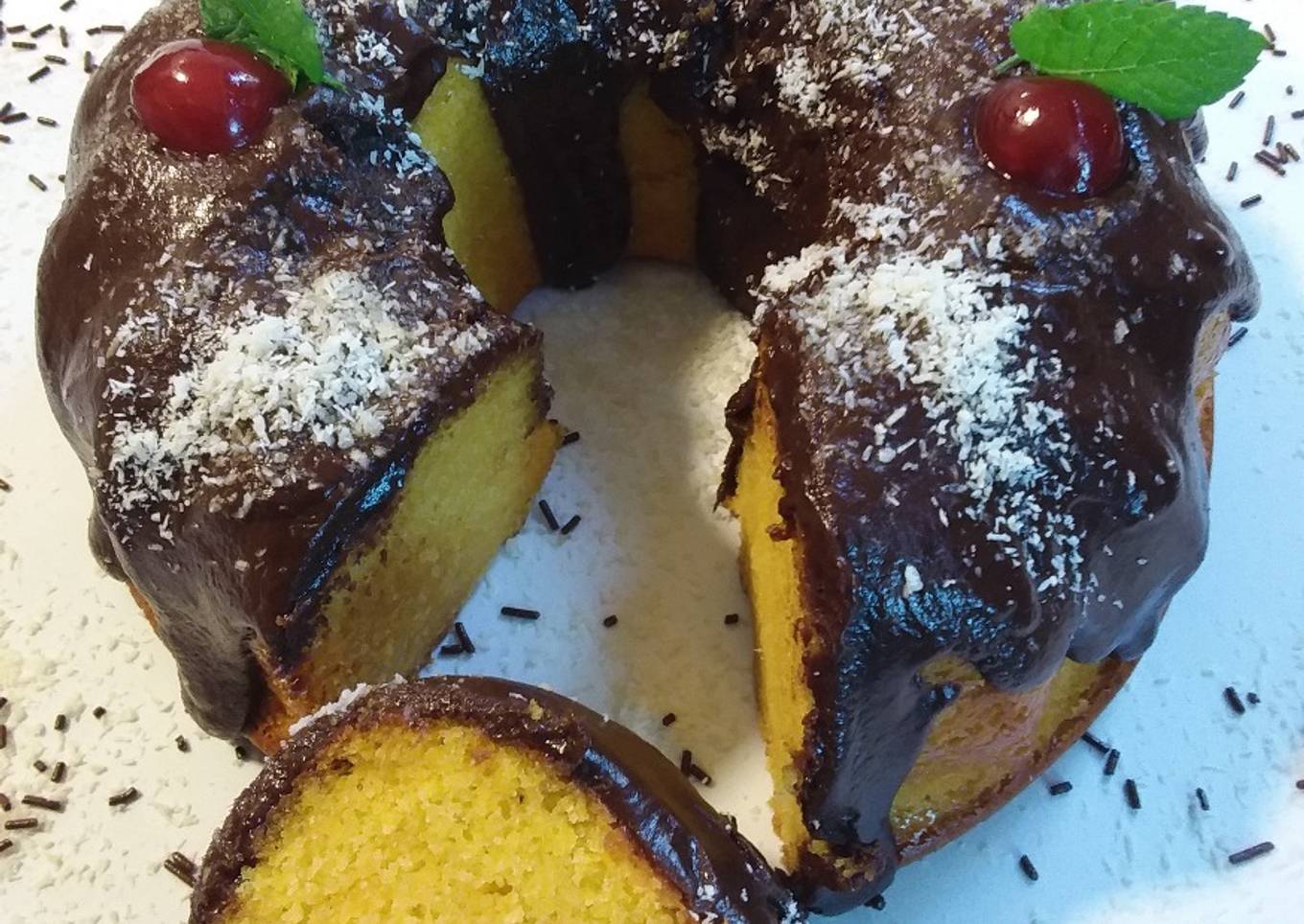 Espolvorear con coco rallado y decorar con unas cerezas.