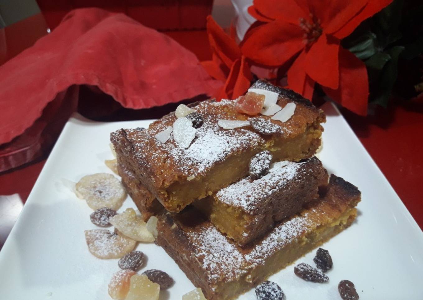 - Dejamos enfriar, desmoldamos y cortamos en cuadraditos que espolvorearemos con azúcar glass.
