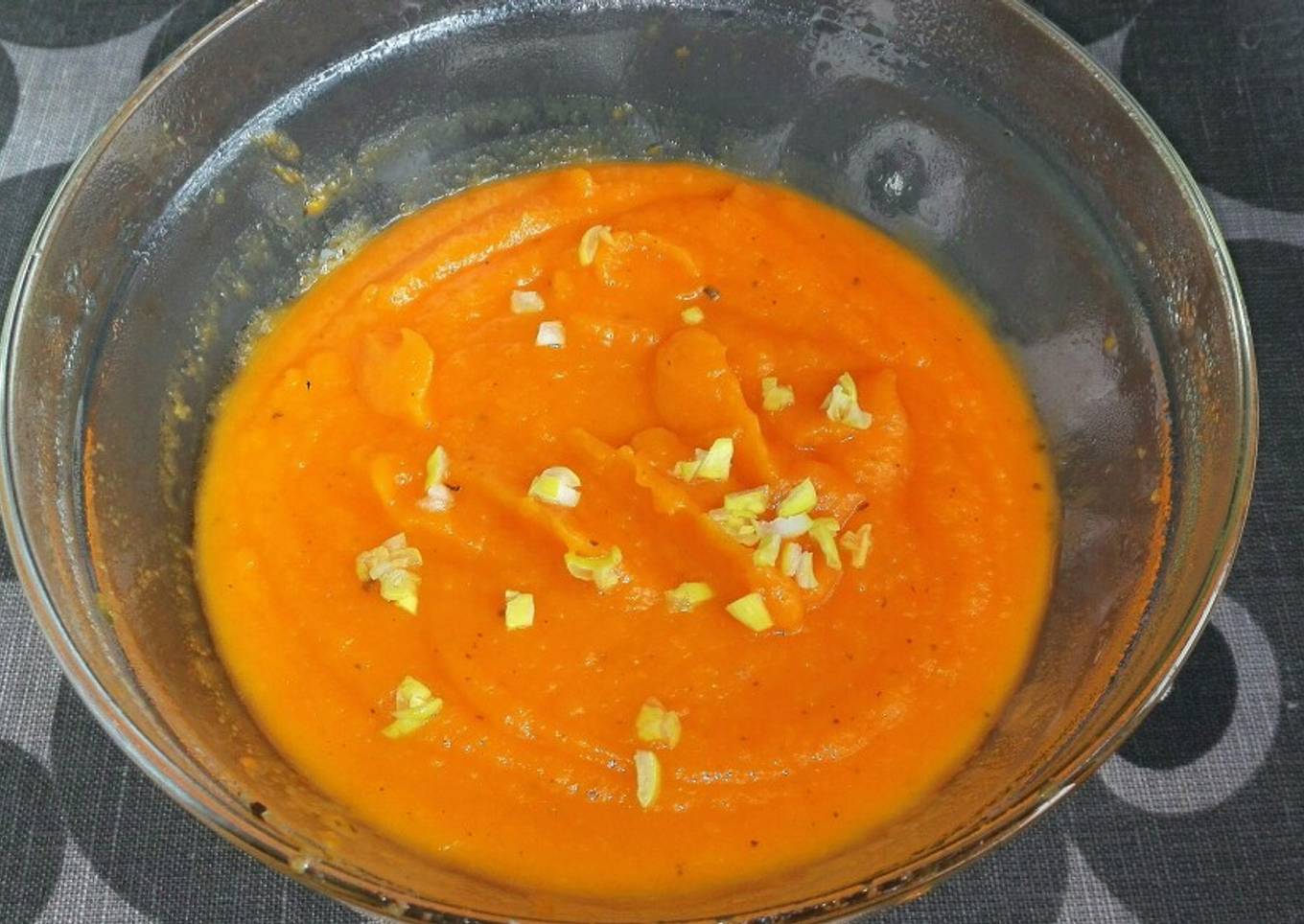 - Pasar la calabaza a un cazo o cazuela pequeña y ponerla a fuego suave. Batirla con la batidora de mano y añadir uns gotas del jugo de un trozo de jengibre rallado. Dependiendo del espesor que nos guste, añadir agua al gusto.