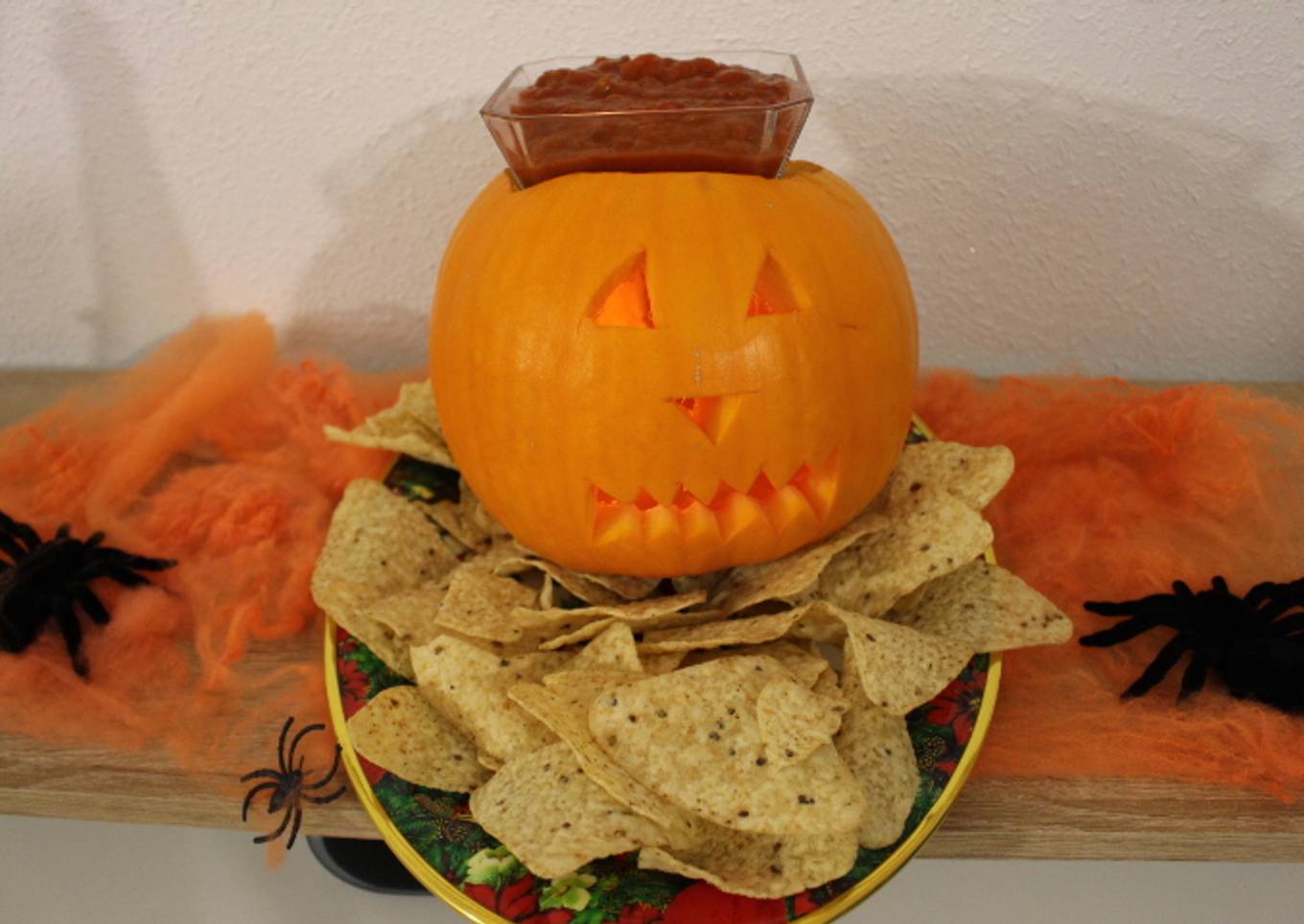 - Cortamos la calabaza ponemos la vela y un bote de salsa y lo rodeamos con nachos